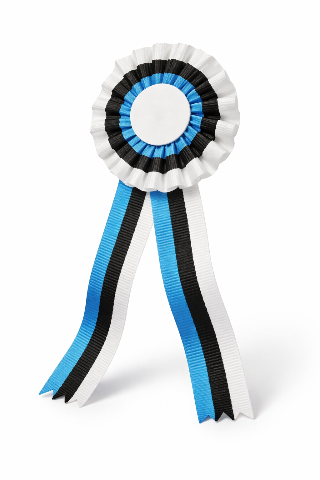Rosett papist südamikuga, taga nõelkinnitus. Läbimõõt 6cm, südamik 2,5cm. Kogupikkus 17cm, paelte läbimõõt 2,2cm.
